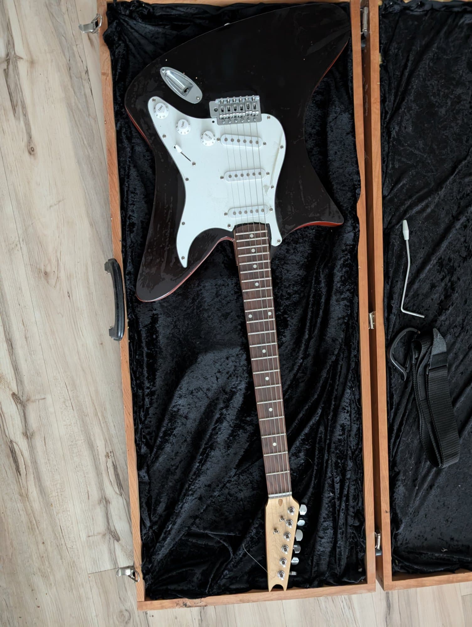 A fully playable handbuilt electric guitar with custom case, intonates correctly, plays in tune up the neck, and sounds exactly like a three-single-coil setup should.